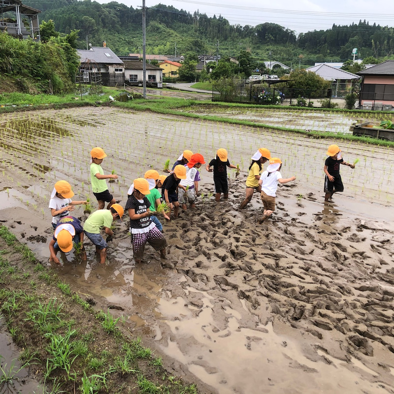 田んぼで田植えして