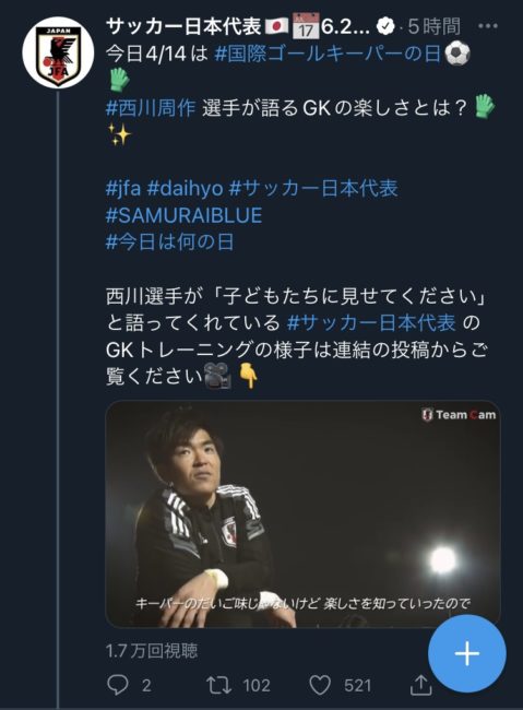 日本代表のSNSでも日本代表GKのインタビューや練習動画など