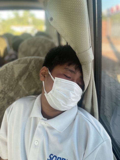 帰りのバス内でお疲れモードの社長
