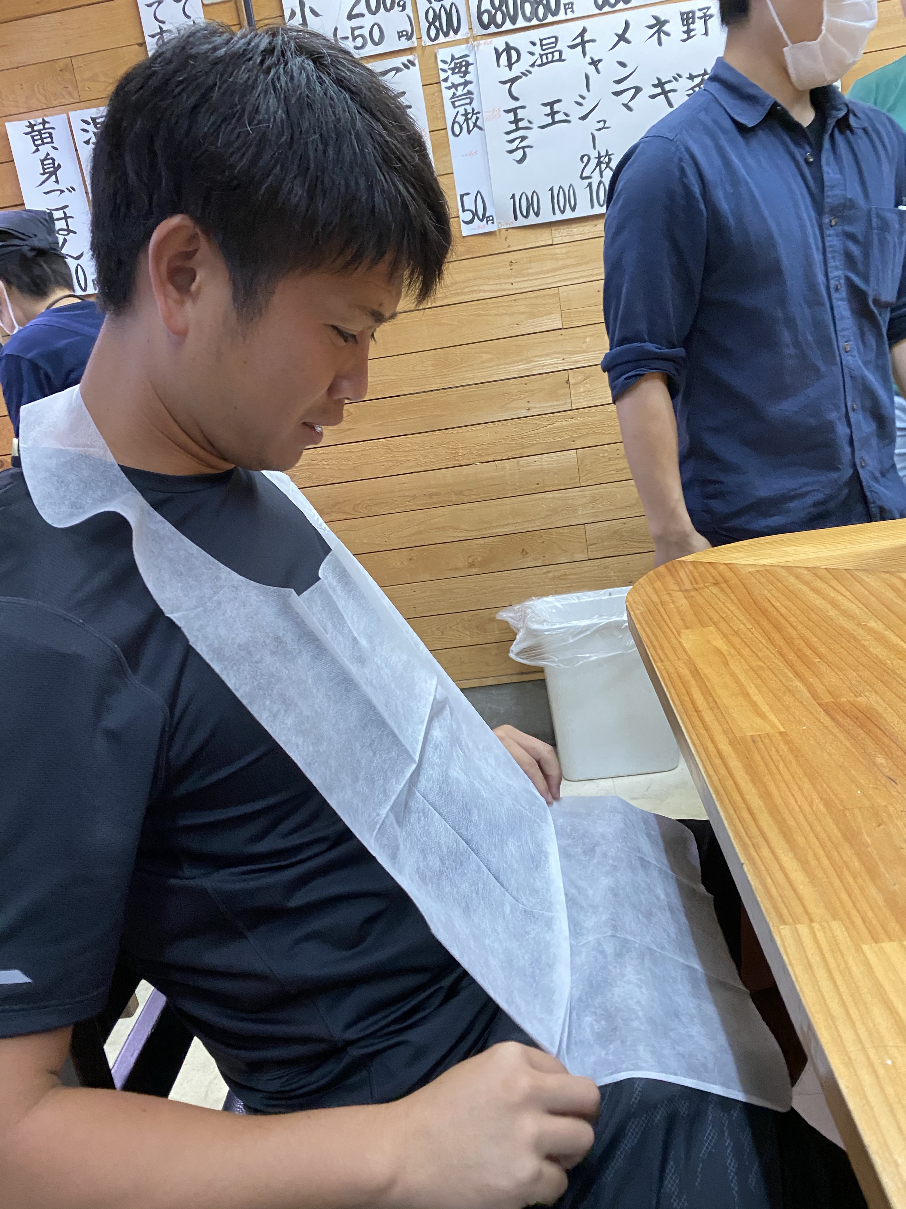 繊細なしげちゃんは紙エプロンを着用。
